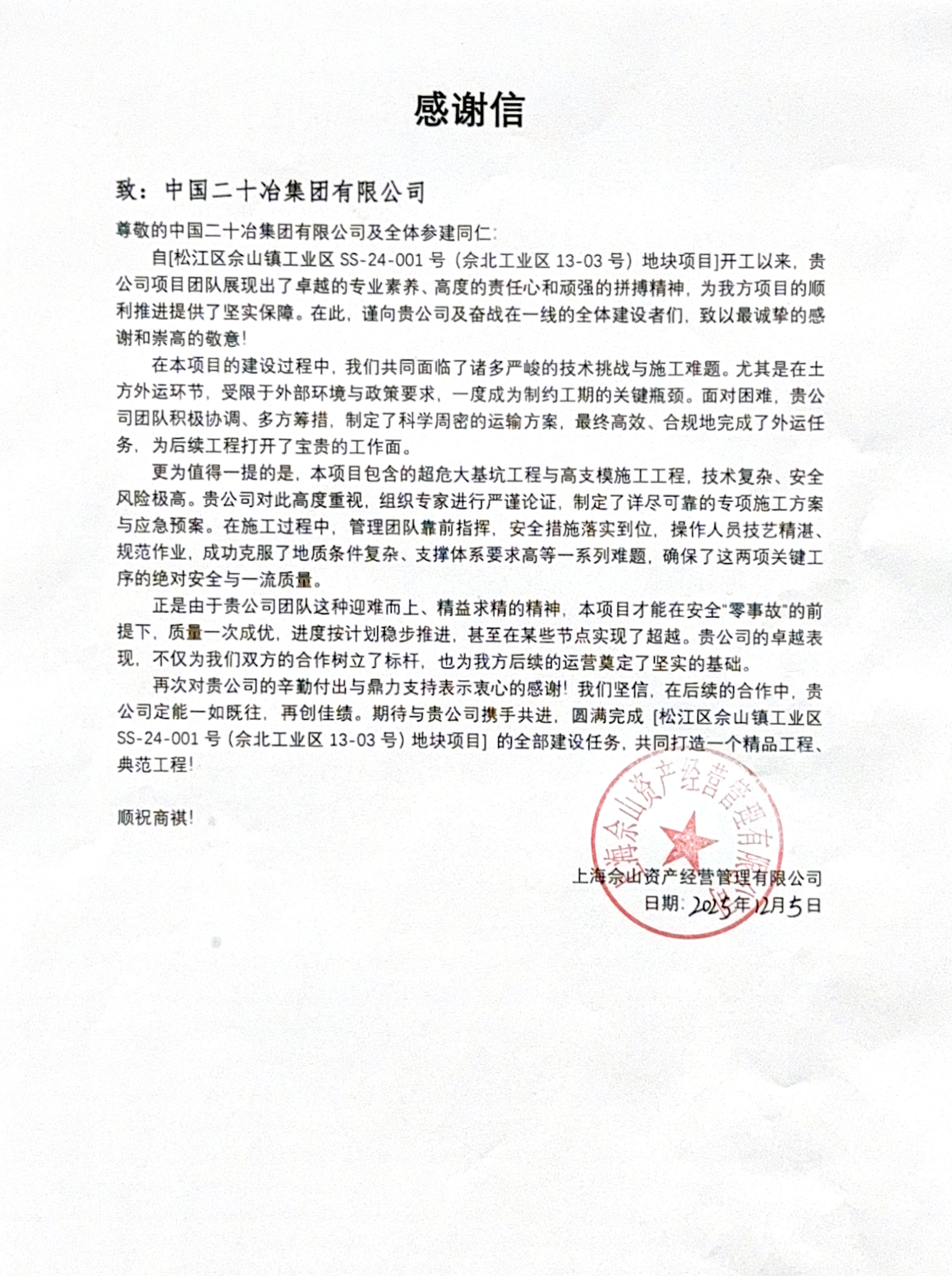 12月5日,建工公司收到上海佘山資產(chǎn)經(jīng)營(yíng)管理有限公司發(fā)來(lái)的感謝信,信中對(duì)松江區(qū)余山鎮(zhèn)工業(yè)區(qū)SS-24-001號(hào)(佘北工業(yè)區(qū)13-03號(hào))地塊項(xiàng)目團(tuán)隊(duì)的專業(yè)表現(xiàn)予以高度贊揚(yáng)。